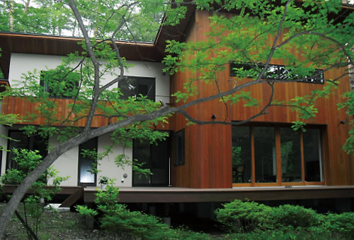 外壁に節なしの杉板を使用していて、別荘らしい落ち着いた建物になっております。
